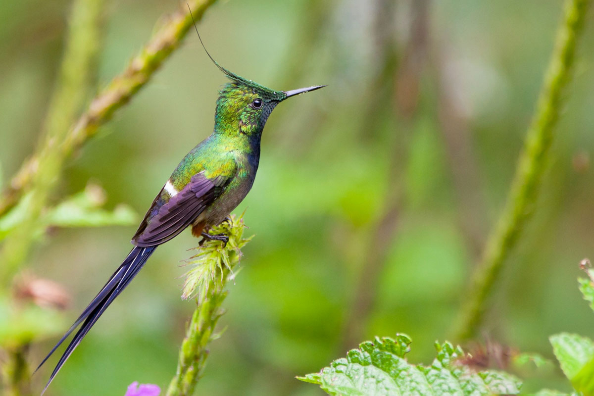 What makes this hummingbird truly extraordinary is its tail, ending in two delicate racket-shaped feathers (in males), and its ability to maneuver among flowers with surgical precision. In Peru, these winged jewels are found mainly in the cloud forest and transition zones toward the lowland jungle, such as the famous route descending from the Andes into Manú National Park. Places like the Kosñipata Valley are sanctuaries where these birds pollinate unique plant species, maintaining a vital balance: without them, many jungle flowers would simply cease to exist.
